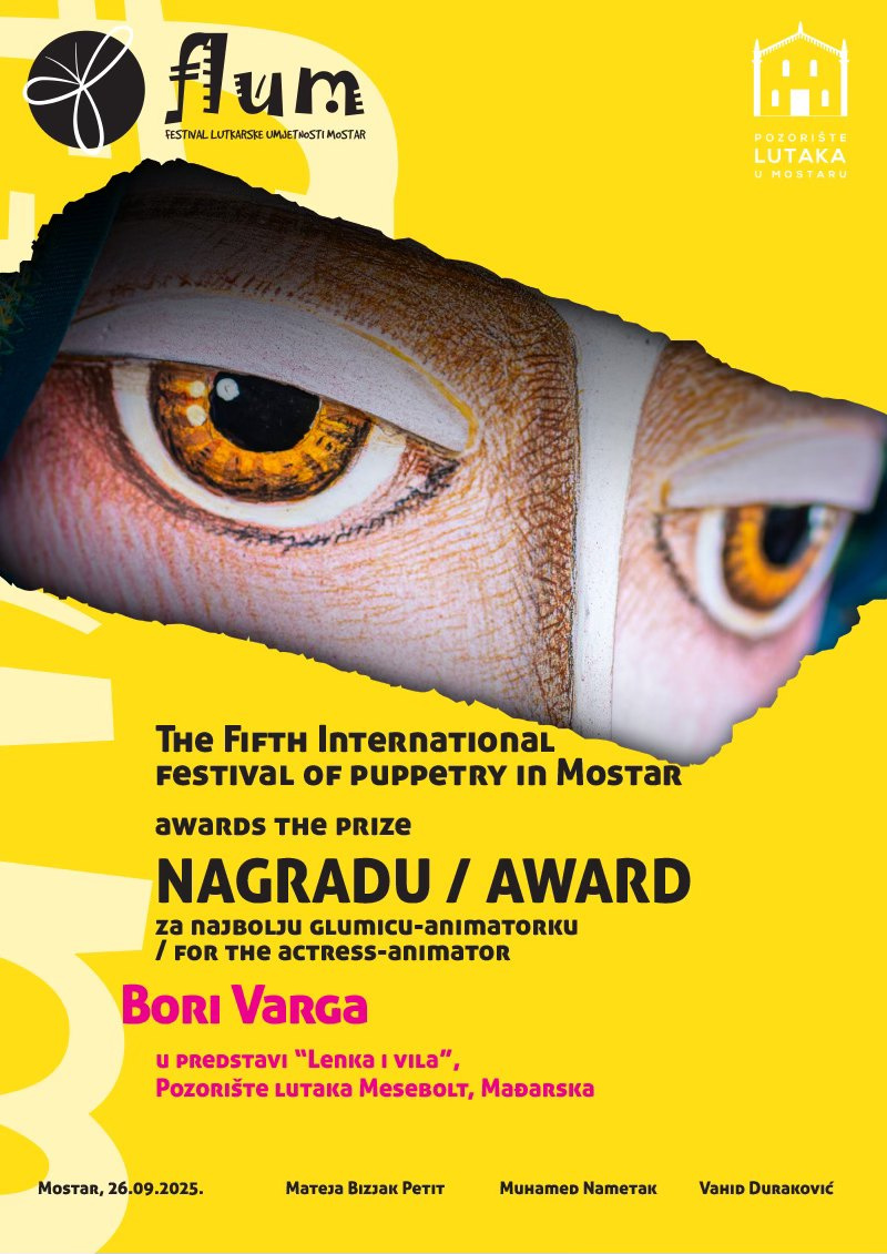 Varga Bori Mostarban az 5. Bábművészeti Fesztiválon (FLUM) színészi díjat kapott a LENKA ÉS A TÜNDÉR című előadással, míg a Kőszegi Várszínházzal közös ÉN, A VÁMPÍR előadásunk Kaczmarski Ágnes felvételével a Papageno különdíját nyerte az 5. eSzínház Fesztiválon! Köszönjük - és ezúton gratulálunk mindkét fesztivál minden díjazottjának!