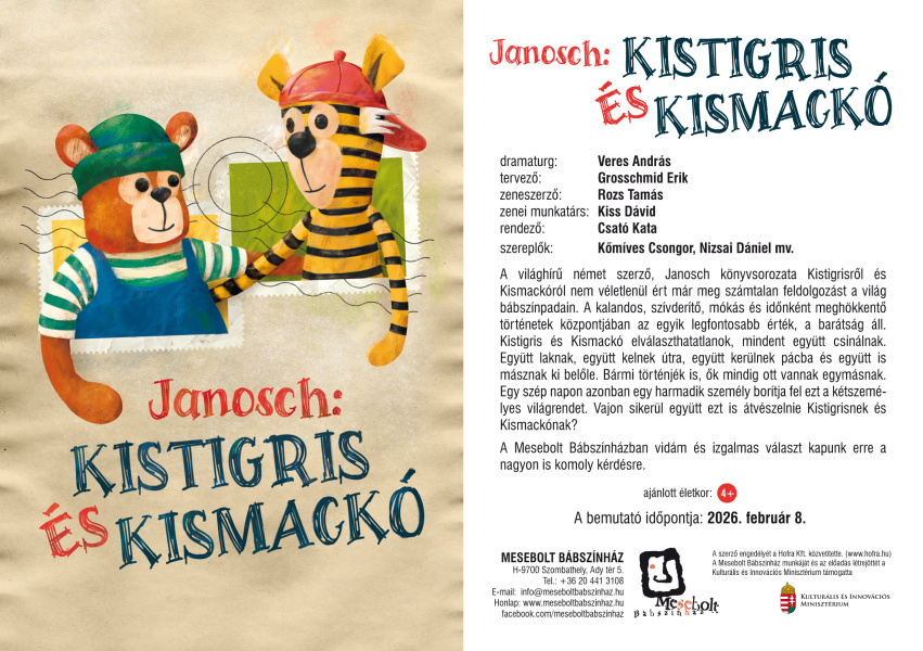 A világhírű német szerző, Janosch könyvsorozata Kistigrisről és Kismackóról nem véletlenül ért már meg számtalan feldolgozást a világ bábszínpadain. A kalandos, szívderítő, mókás és időnként meghökkentő történetek központjában az egyik legfontosabb érték, a barátság áll. Kistigris és Kismackó elválaszthatatlanok, mindent együtt csinálnak. Együtt laknak, együtt kelnek útra, együtt kerülnek pácba és együtt is másznak ki belőle. Bármi történjék is, ők mindig ott vannak egymásnak. Egy szép napon azonban egy harmadik személy borítja fel ezt a kétszemélyes világrendet. Vajon sikerül együtt ezt is átvészelnie Kistigrisnek és Kismackónak?